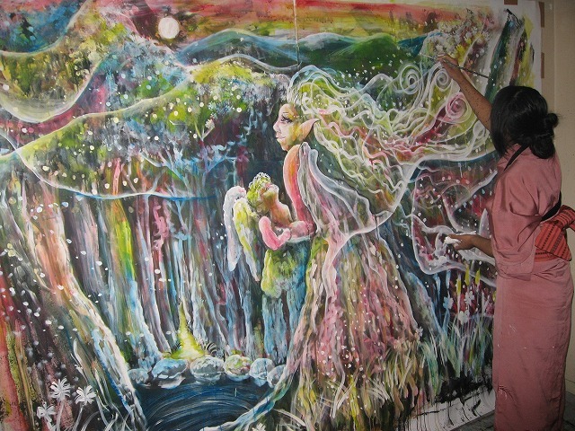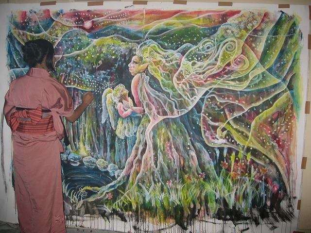 | 4枚目の作品のストーリーは天界と冥界からの魔の手から娘を守り続け、やっと、トンネルを発見しました。そのトンネルの先は天人も冥人も暮らせる場所に繋がるという世界。しかし、母はもう力尽きてました。徐々に身体が動かなくなり、足元から木に変化してゆきます。しかし、彼女はとても幸せな気分です。根を沼に伸ばして、泡となった彼に今の思いを伝えています。その根から伝わる思いに反応した彼は。。。。 |